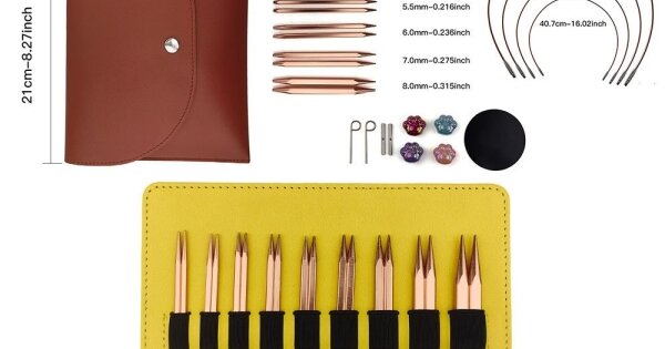 Розмір: до набору входять 9 пар спиць довжиною 11,5 см розміром від 3,5 мм до 8 мм (3,5; 3,75; 4,0; 4,5; 5,0; 5,5; 6,0; 7,0; 8,0) з гравіюванням розміру на кожній спиці.