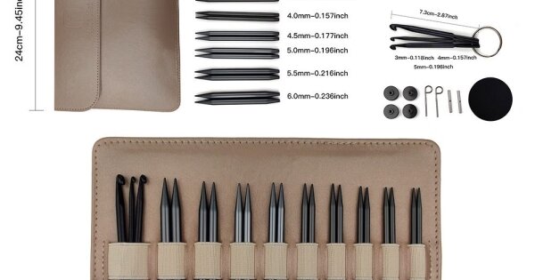 Розмір: до набору входять 9 пар спиць довжиною 8 см від 3,0 мм до 6,0 мм (3,0, 3,25; 3,5; 3,75; 4,0; 4,5; 5,0; 5,5; 6,0)